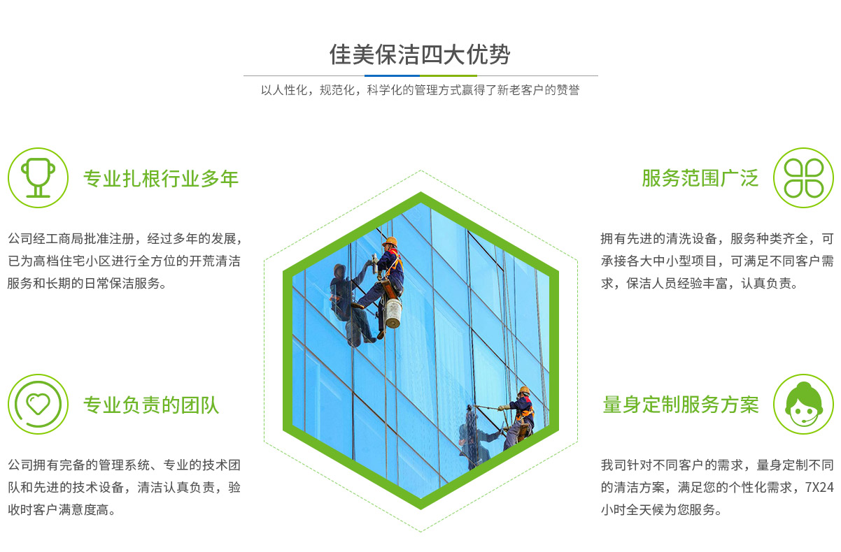 - 馬鞍山市佳美保潔服務(wù)有限公司是一家經(jīng)工商部門批準,具有法人資格專業(yè)清洗,馬鞍山保潔服務(wù)的公司,自創(chuàng)辦以來,一直致力于企業(yè),家庭,賓館,學校,別墅,酒店,商廈,公共設(shè)施等場所提供科學的日常保潔和清潔保護的服務(wù)公司,有著豐富的管理服務(wù)和保潔經(jīng)驗...